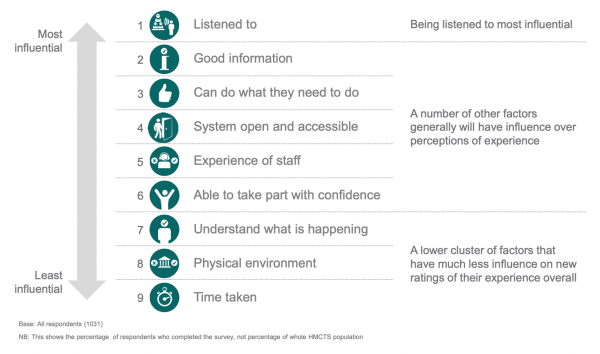 - Key driver analysis [see below] was used to explore how different factors (drivers), influence user experience. Three clusters of factors were found to have an impact on users’ overall rating of their experience. The most important factor was being listened to, which was found to be more than twice as influential on overall rating of experience than the other factors. There was some variation between jurisdictions, but being listened to was the most influential driver throughout.